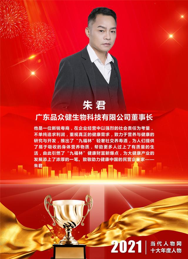 ▋颁奖词:他是一位新锐粤商,在企业经营中以强烈的社会责任为考量,不单纯追求利润,重视真正的健康需求,致力于营养与健康的研究与开发,推出了“九福林”轻奢社交养寿酒,为人们提供了易于吸收的身体营养物质,帮助更多人过上了有质量的生活,由此引燃了“九福林”健康财富新爆点,为大健康产业的发展添上了浓厚的一笔。致敬助力健康中国的民营企业家——朱君
