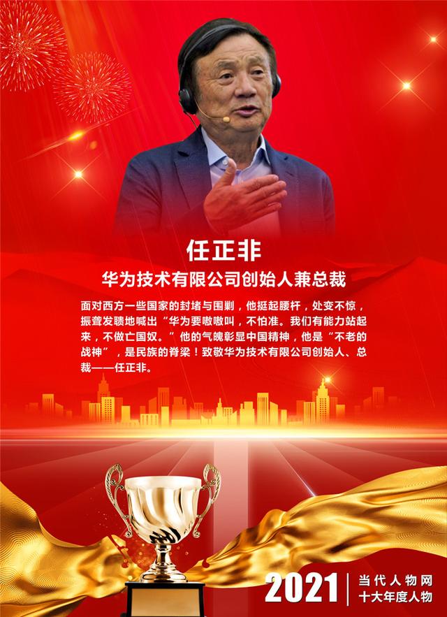 ▋颁奖词:面对西方一些国家的封堵与围剿,他挺起腰杆,处变不惊,振聋发聩地喊出“华为要嗷嗷叫,不怕谁。我们有能力站起来,不做亡国奴。”任正非的气魄彰显中国精神,他是“不老的战神”,是民族的脊梁!致敬华为技术有限公司创始人、总裁——任正非。