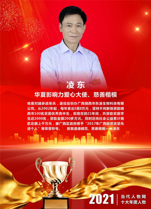 ▋颁奖词:他是对越参战老兵,退役后创办广西靖西市东凌生物科技有限公司。从2002年起,每年拿出5至8万元,坚持不间断地资助靖西市100名贫困优秀高中生,到现在的21年间,共资助贫困学生近2000名,资助金额200多万元。同时还向社会公益累计捐款总额上千万元,被广西区政府授予“2017年广西脱贫攻坚先进个人”等荣誉称号。致敬道德模范、慈善楷模——凌东