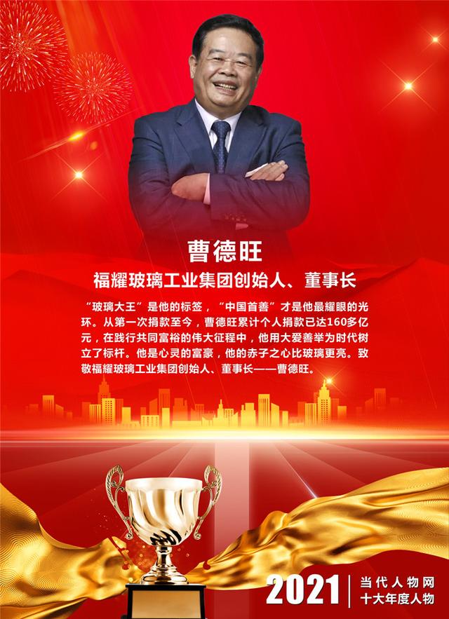 ▋颁奖词:“玻璃大王”是他的标签,“中国首善”才是他最耀眼的光环。从第一次捐款至今,曹德旺累计个人捐款已达160多亿元,在践行共同富裕的伟大征程中,他用大爱善举为时代树立了标杆。他是心灵的富豪,他的赤子之心比玻璃更亮。致敬福耀玻璃工业集团创始人、董事长——曹德旺。