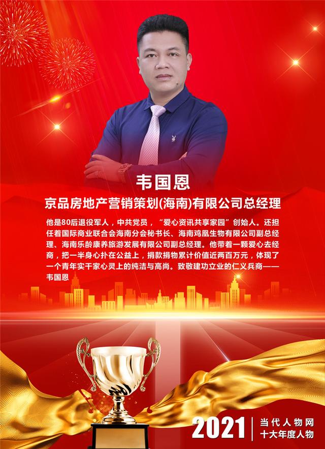 ▋颁奖词:他是80后退役军人,中共党员,“爱心资讯共享家园”创始人。还担任着国际商业联合会海南分会秘书长、海南鸡凰生物有限公司副总经理、海南乐龄康养旅游发展有限公司副总经理。他带着一颗爱心去经商,把一半身心扑在公益上,捐款捐物累计价值近两百万元,体现了一个青年实干家心灵上的纯洁与高尚。致敬建功立业的仁义兵商——韦国恩