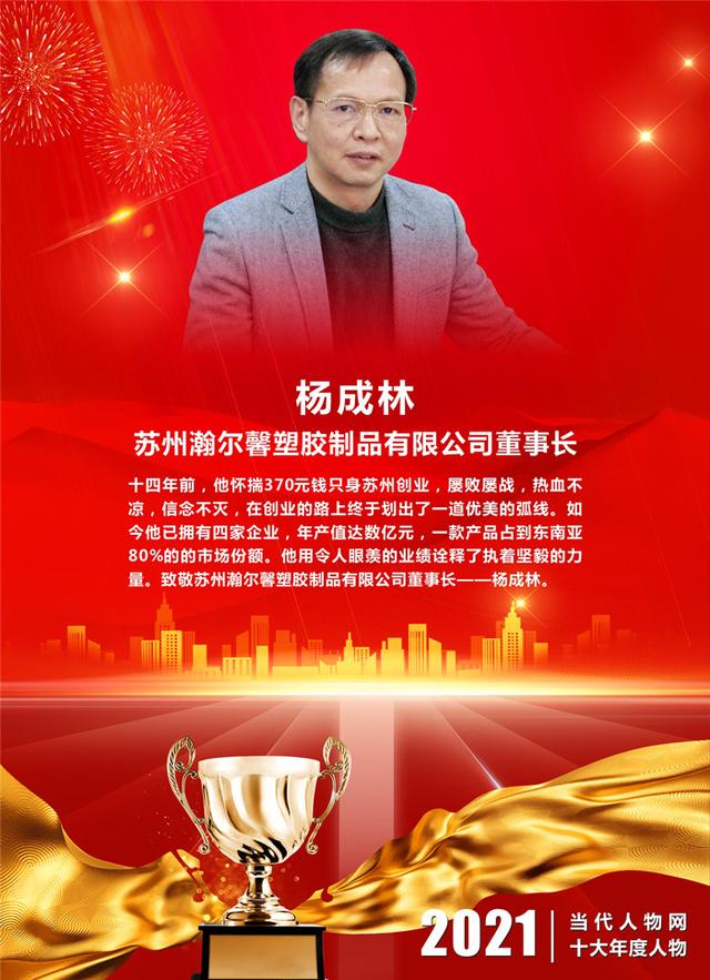 ▋颁奖词:十四年前,他怀揣370元钱只身苏州创业,屡败屡战,热血不凉,信念不灭,在创业的路上终于划出了一道优美的弧线。如今他已拥有四家企业,年产值达数亿元,一款产品占到东南亚80%的市场份额。他用令人眼羡的业绩诠释了执着坚毅的力量。致敬苏州瀚尔馨塑胶制品有限公司董事长——杨成林。