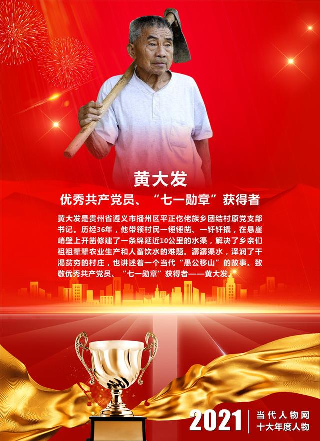 ▋颁奖词:黄大发是贵州省遵义市播州区平正仡佬族乡团结村原党支部书记。历经36年,他带领村民一锤锤凿、一钎钎撬,在悬崖峭壁上开凿修建了一条绵延近10公里的水渠,解决了乡亲们祖祖辈辈农业生产和人畜饮水的难题。潺潺渠水,泽润了干渴贫穷的村庄,也讲述着一个当代“愚公移山”的故事。致敬优秀共产党员、“七一勋章”获得者——黄大发。