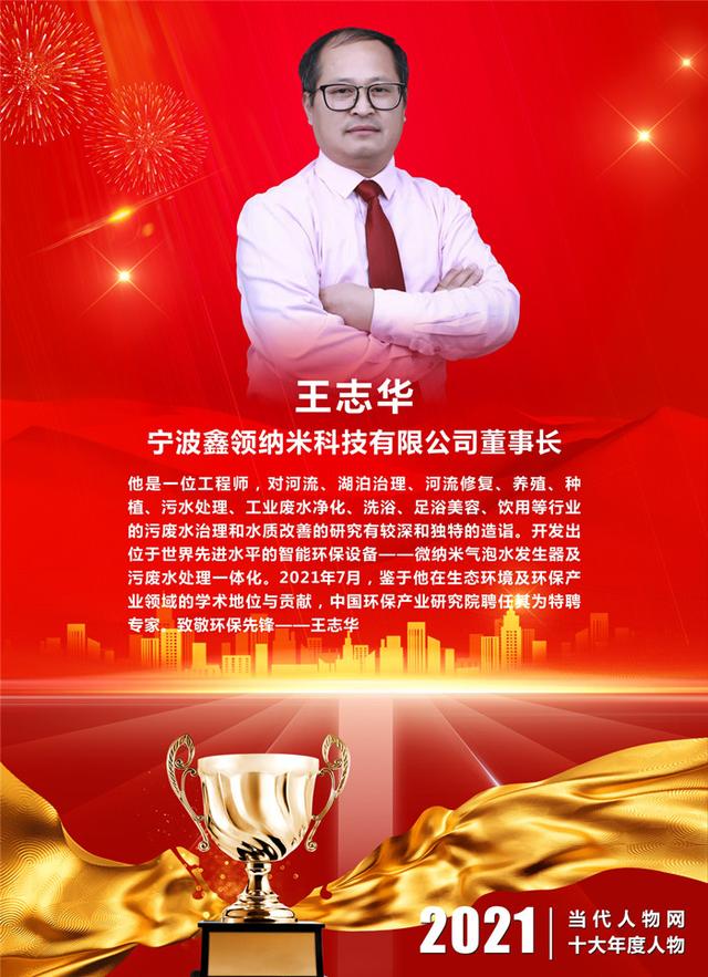 ▋颁奖词:他是一位工程师,对河流、湖泊治理、河流修复、养殖、种植、污水处理、工业废水净化、洗浴、足浴美容、饮用等行业的污废水治理和水质改善的研究有较深和独特的造诣。开发出位于世界先进水平的智能环保设备——微纳米气泡水发生器及污废水处理一体化。2021年7月,鉴于他在生态环境及环保产业领域的学术地位与贡献,中国环保产业研究院聘任其为特聘专家。致敬环保先锋——王志华