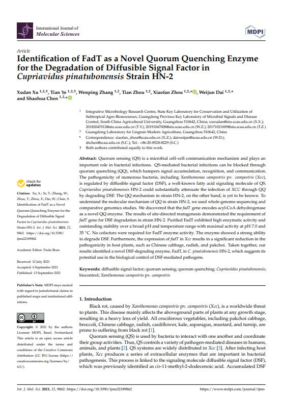 在广东地区高校昆虫标本制作大赛、群体微生物研究中心大创项目、三下乡扶贫支农调研等各级各类比赛和活动中,都有许旭丹活跃的身影。在不止步的探索下,她收获了累累硕果:于本科期间以第一作者、共同第一作者等身份发表SCI论文四篇,累计影响因子20.1,同时申请了国家级发明专利三项,其中一项已授权。